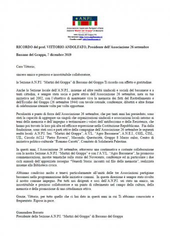 Anche la Sezione locale dell’A.N.P.I., insieme ad altre realtà sindacali e sociali del bassanese e a tanti cittadini, è sempre stata socia e parte attiva dell’Associazione 26 settembre, nata su tua iniziativa nel 2002, con l’obiettivo di mantenere viva la memoria dei fatti del Rastrellamento e dell'Eccidio del Grappa (26 settembre 1944) con tavole rotonde, conferenze, dibattiti e altre forme di celebrazione ritenute volta per volta opportune.