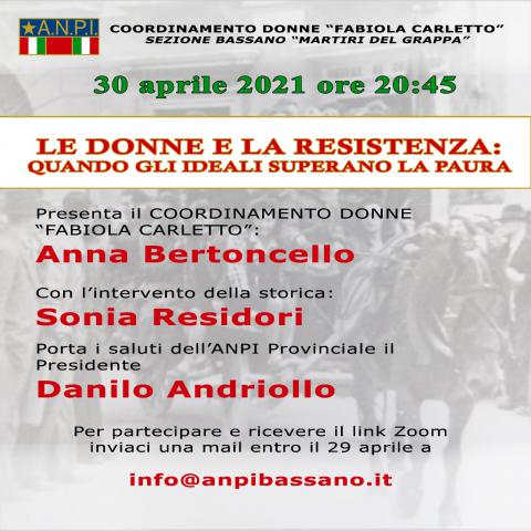 Inoltre, in prossimità del 76° Anniversario della Liberazione, come già preannunciato in sede di assemblea dei soci in videoconferenza lo scorso 31 marzo 2021, il Coordinamento Donne della nostra Sezione, con il sostegno dell’A.N.P.I. provinciale di Vicenza, propone per venerdì 30 aprile 2021 alle ore 20:45 in videoconferenza (tramite la piattaforma Zoom dell'A.N.P.I. provinciale di Vicenza) l'evento "LE DONNE E LA RESISTENZA: QUANDO GLI IDEALI SUPERANO LA PAURA" , con la presentazione del Coordinamento Donne da poco costituitosi e l’intitolazione alla memoria della nostra socia e dirigente “storica” Fabiola Carletto (che l’aveva fondato) e con un intervento di analisi e approfondimento storiografico a cura della dott.ssa Sonia Residori (storica della Resistenza vicentina e delle Donne). Si veda l'allegata locandina. Per partecipare all'evento e ricevere il link Zoom occorre inviare un'e-mail a info@anpibassano.it entro giovedì 29 aprile 2021.