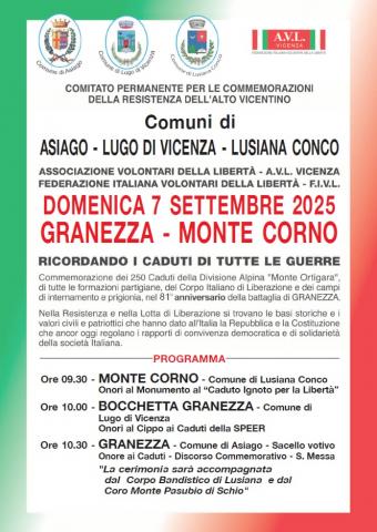 Nel 81° anniversario della Battaglia di Granezza vengono commemorati i caduti durante il rastrellamento, ma anche i 250 caduti della Divisione Alpina “Monte Ortigara”, di tutte le formazioni partigiane, del corpo italiano di liberazione e dei campi di internamento e prigionia.