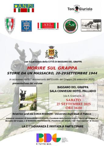 In occasione dell'81° anniversario dell'Eccidio del Grappa (26 settembre 2025), sabato 27 settembre 2025 alle ore 16:00 a Bassano del Grappa presso la Sala convegni dell'Hotel Palladio (via A. Gramsci n. 2) avrà luogo la presentazione del nuovo volume di Sonia Residori "Morire sul Grappa. Storie da un massacro, 20-29 settembre 1944", appena pubblicato da Donzelli Editore.