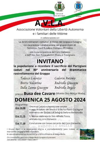 L’Amministrazione Comunale di Borso del Grappa e l'A.V.L.A. - Associazione Volontari della Libertà Autonoma e i Familiari delle Vittime, in collaborazione con il Gruppo Alpini di Semonzo e Sant'Eulalia e con la partecipazione del Gruppo Alpini di Romano d'Ezzelino, del Coro Edelweiss e dell’Ass. Naz. Paracadutisti d’Italia di Trevignano