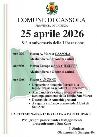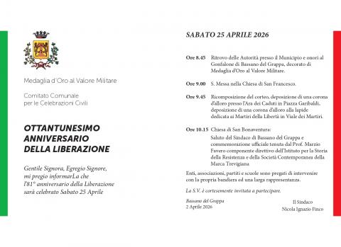Inoltre, la celebrazione dell'81° anniversario della Liberazione, nel nostro territorio vicentino, si caratterizzerà per un evento particolarmente importante, ovvero il conferimento della Medaglia d'Argento al Valor Militare alla Città di Thiene; la relativa cerimonia avrà luogo domenica 26 aprile 2026 con raduno alle ore 10:30 in Piazza Chilesotti (si veda l'allegato programma degli eventi).